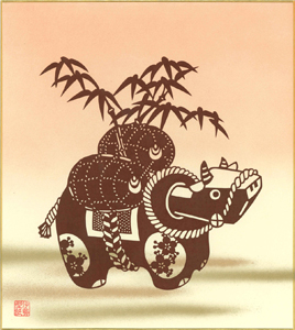 伝統工芸・伊勢型紙による手彫り型紙の丑年(ウシ)の干支色紙を販売しています。
