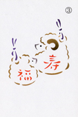 渋紙の年賀状型紙は水に強く伸縮が少ないとはいえ、多くの枚数を刷りこんでいると、次第に絵具の水分を含んで部分的に伸長が起こり、刷り難くなってきます。そこで、渋紙の表面に樹脂塗料(黒色)を塗り、水分を吸収しにくくしました。これにより、通常の渋紙に比べ、一度に多くの枚数を刷ることができます。(通常の渋紙も、部分伸長した場合には、作業を中断し乾燥させることで何度も使用可能です。)