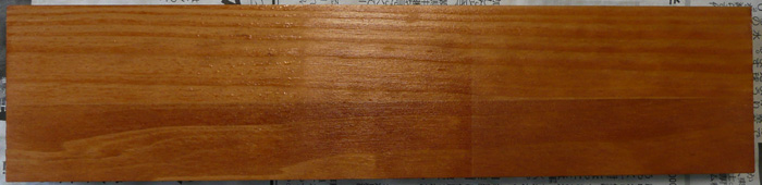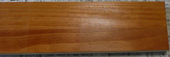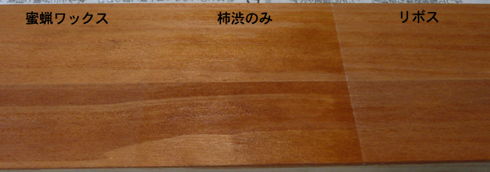 パイン集成材に柿渋(無臭品)を塗り数日発色させた後、蜜蝋ワックス(左端)とリボス(右端)を塗ったものです。