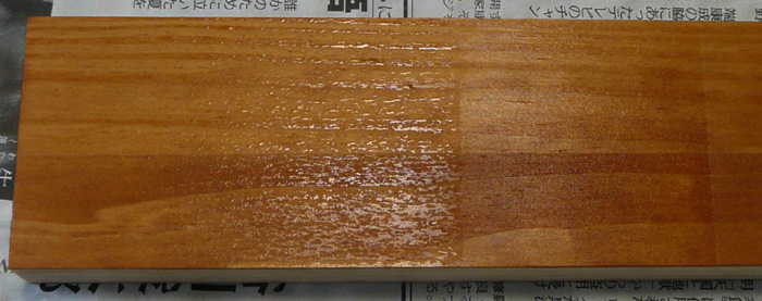 以上のことから、柿渋を再塗装しようとする場合、蜜蝋ワックスの方が、リボス(ワックス系グレイボ)よりも、浸透しにくいと思われます。(蜜蝋ワックスでも柿渋を薄く伸ばしながら塗ることは可能でしょう。)