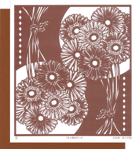 従来の図案入り型紙と比べると、出来上がりがイメージしやすく、また渋紙自体に黒く印刷してありませんので、彫刻の際に輪郭線から多少ズレても出来上がりに支障がありません。ただ、2枚を重ねて一緒に彫刻するため、慣れないと彫り難く感じられます。→ 図案入り型紙と型紙付き図案の比較