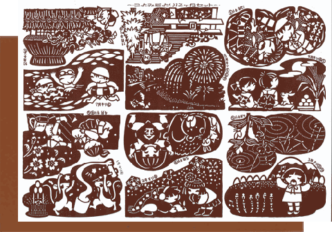 12カ月分の図案(はがきサイズ)を、A3サイズ1枚にまとめたもの(渋紙付き)です。
