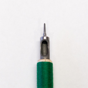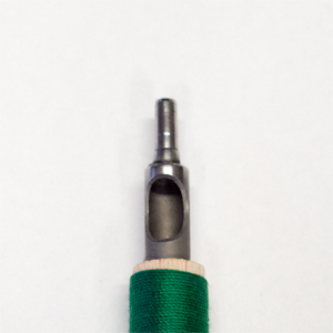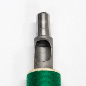 - 反対の手は、親指が柄の端を押すようにして柄全体を握ります。この時、錐が垂直になるように気をつけます 。