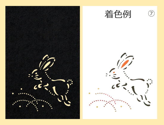 ※左が年賀状型紙で、右は顔彩絵の具「四季の彩」を使って作成した着色例(コピーを商品に付属)です。