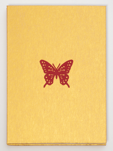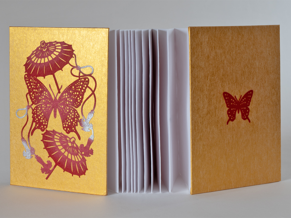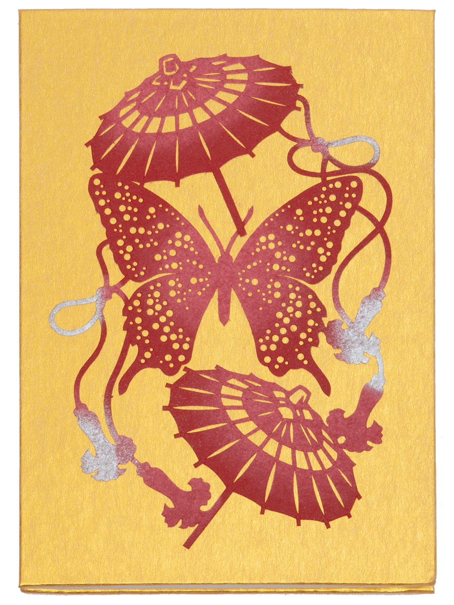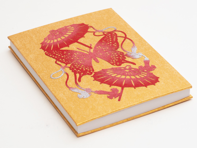 手彫りの伊勢型紙「蝶に和傘」を金潜紙(きんせんし)の表紙にあしらった御朱印帳です。