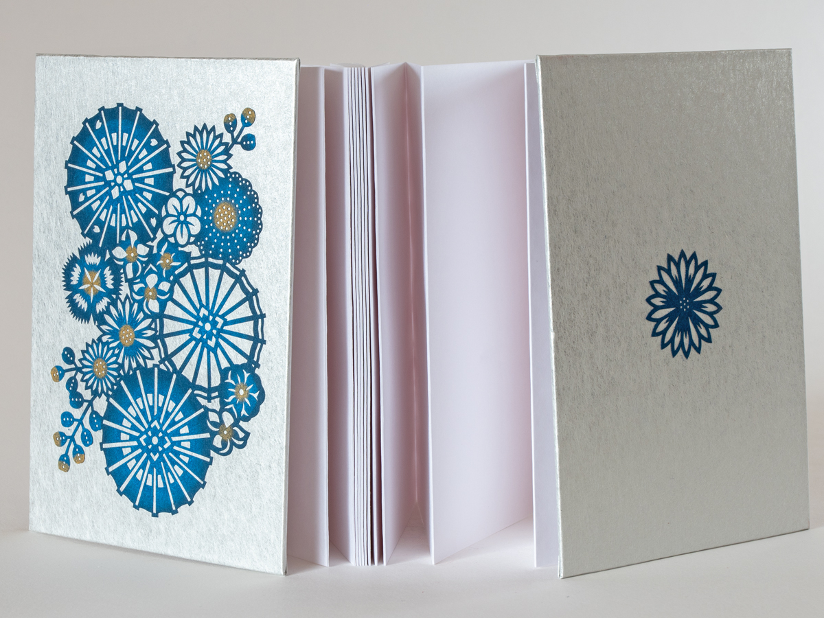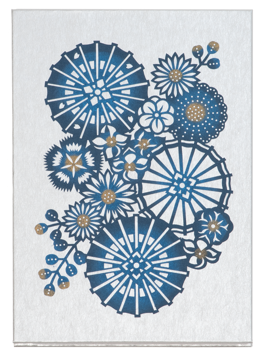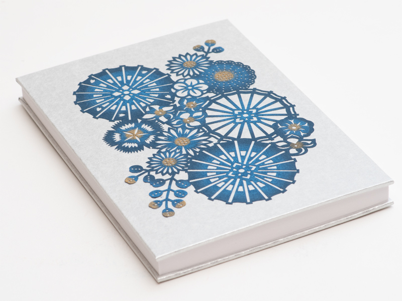 手彫りの伊勢型紙「和傘に花尽くし」を銀潜紙(ぎんせんし)の表紙にあしらった御朱印帳です。